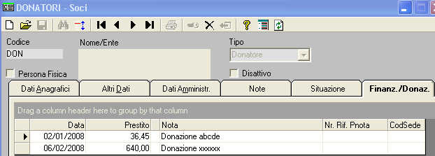 L' anagrafica "Donatori" oltre ai dati anagrafici e altri, nella sottosch. Amministrazione prevede l'immissione di :